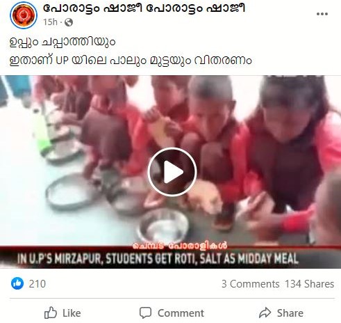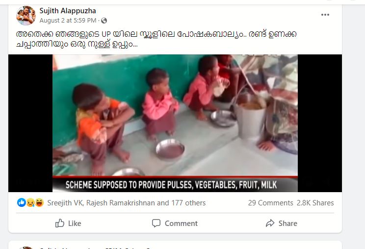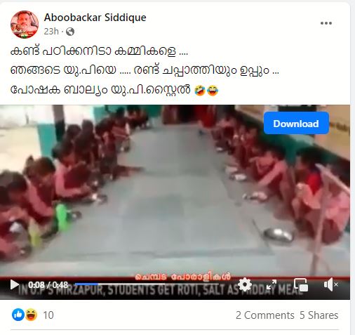 ”അതൊക്കെ ഞങ്ങളുടെ യുപി യിലെ സ്കൂളിലെ പോഷകബാല്യം. രണ്ട് ഉണക്ക ചപ്പാത്തിയും ഒരു നുള്ള് ഉപ്പും,” എന്നാണ് വിഡീയോയ്ക്ക് ഒപ്പമുള്ള കുറിപ്പ് പറയുന്നത്. Sujith Alappuzha എന്ന ഐഡിയിൽ നിന്നുള്ള വീഡീയോ ഞങ്ങൾ കാണുമ്പോൾ 2.8 k ഷെയറുകൾ ഉണ്ടായിരുന്നു.
