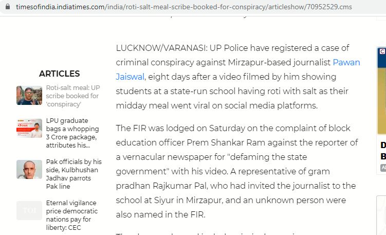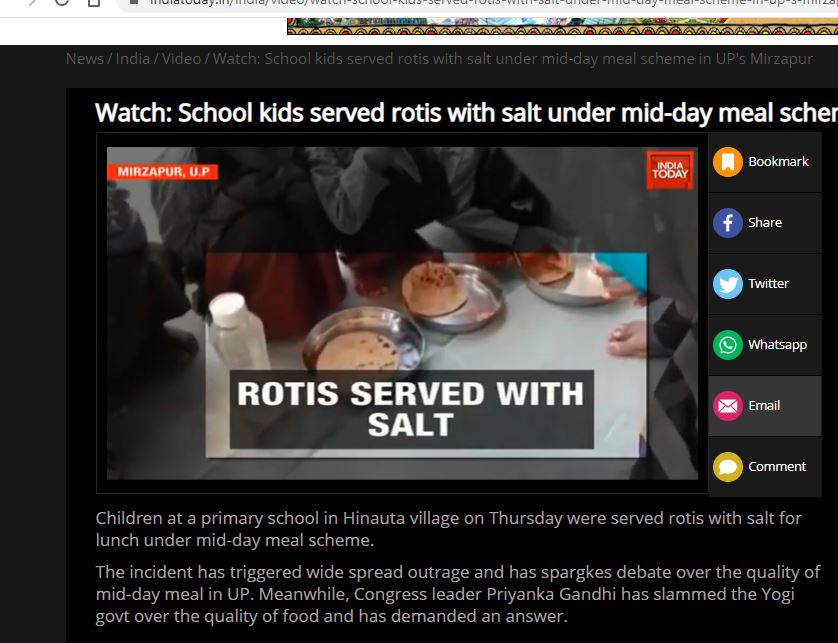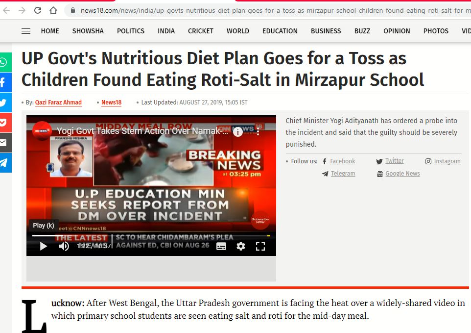 യുപിയിലെ മിർസാപൂരിൽ സ്കൂൾ കുട്ടികൾക്ക് ഉച്ചഭക്ഷണ പദ്ധതി പ്രകാരം റൊട്ടിയും ഉപ്പും വിളമ്പി എന്നുള്ള ഈ വാർത്ത ഓഗസ്റ്റ് 27 2019 ൽ ന്യൂസ് 18 നും കൊടുത്തിട്ടുണ്ട്.