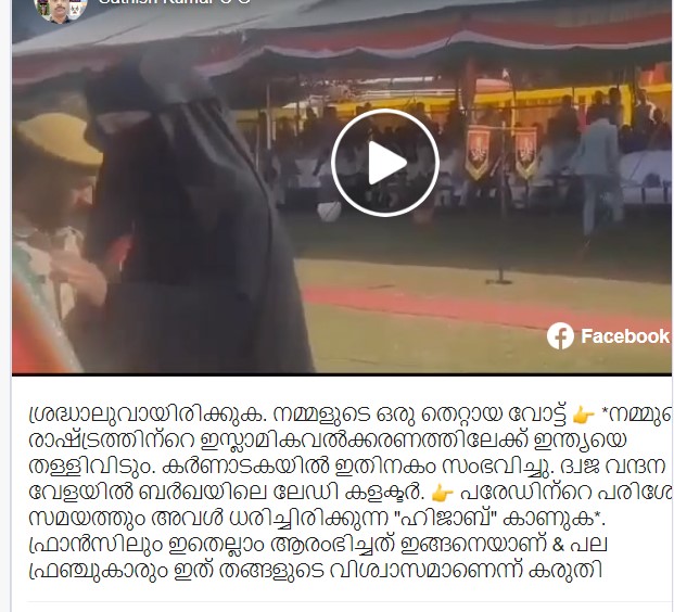 “ശ്രദ്ധാലുവായിരിക്കുക. ഹിന്ദുക്കളുടെ ഒരു തെറ്റായ വോട്ട് നമ്മുടെ രാഷ്ട്രത്തിന്റെ ഇസ്ലാമികവൽക്കരണത്തിലേക്ക് ഇന്ത്യയെ തള്ളിവിടും. കർണാടകയിൽ ഇതിനകം സംഭവിച്ചു. ദ്വജ വന്ദന വേളയിൽ ബർഖയിലെ ലേഡി കളക്ടർ. പരേഡിന്റെ പരിശോധന സമയത്തും അവൾ ധരിച്ചിരിക്കുന്ന ‘ഹിജാബ്’ കാണുക. ഫ്രാൻസിലും ഇതെല്ലാം ആരംഭിച്ചത് ഇങ്ങനെയാണ്. പല ഫ്രഞ്ചുകാരും ഇത് തങ്ങളുടെ വിശ്വാസമാണെന്ന് കരുതി,” എന്നാണ് പോസ്റ്റിനൊപ്പമുള്ള വിവരണം.