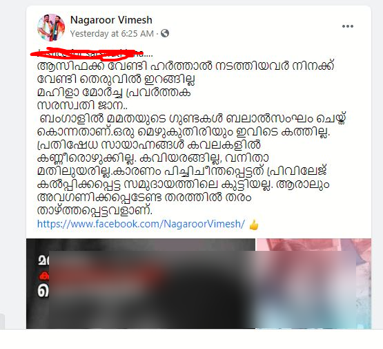 ബംഗാളിലെ തിരഞ്ഞെടുപ്പിന് ശേഷം ഉണ്ടായ സംഘർഷത്തിൽ ഒരു ബി ജെപി പ്രവർത്തകയായ കോളേജ് വിദ്യാർഥിനി സ്നേഹ (മാറ്റിയ പേര്) ബലാൽസംഗം ചെയ്തു കൊല്ലപ്പെട്ടുവെന്ന് പറയുന്ന ഒരു പോസ്റ്റ് മലയാളത്തിൽ വൈറൽ ആയികൊണ്ടിരിക്കുകയാണ്.