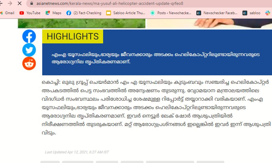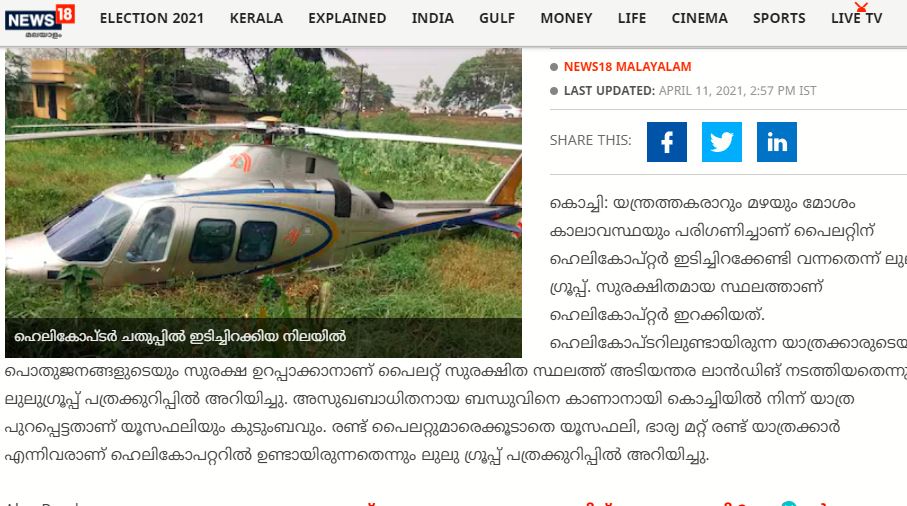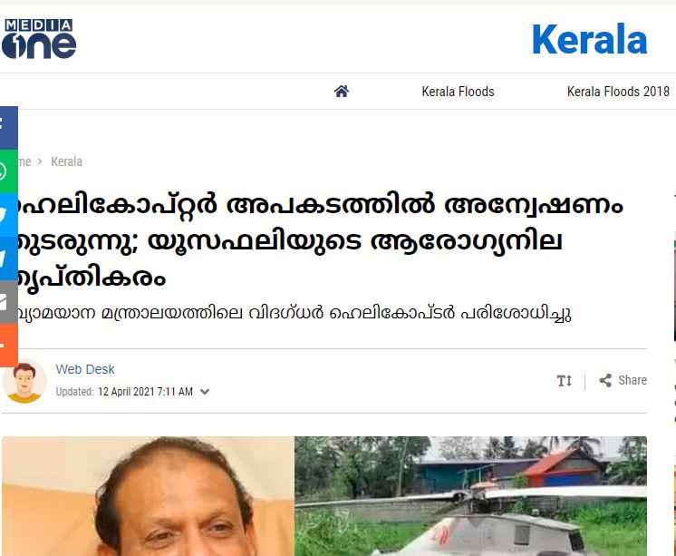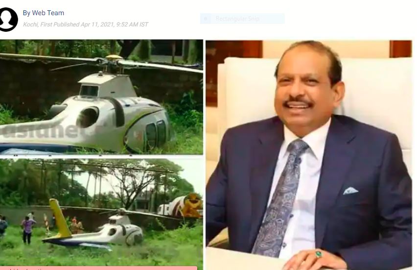 കേരളത്തിലെ പ്രമുഖ വ്യവസായിയും ലുലു ഗ്രൂപ്പ് ചെയർമാനും മാനേജിങ് ഡിറ്റക്ടറുമായ എം എ യൂസഫലിയ്ക്ക് ഒരു ഹെലികോപ്റ്റർ അപകടത്തിൽ പരിക്കേറ്റത് ഏപ്രിൽ 11നാണ്.