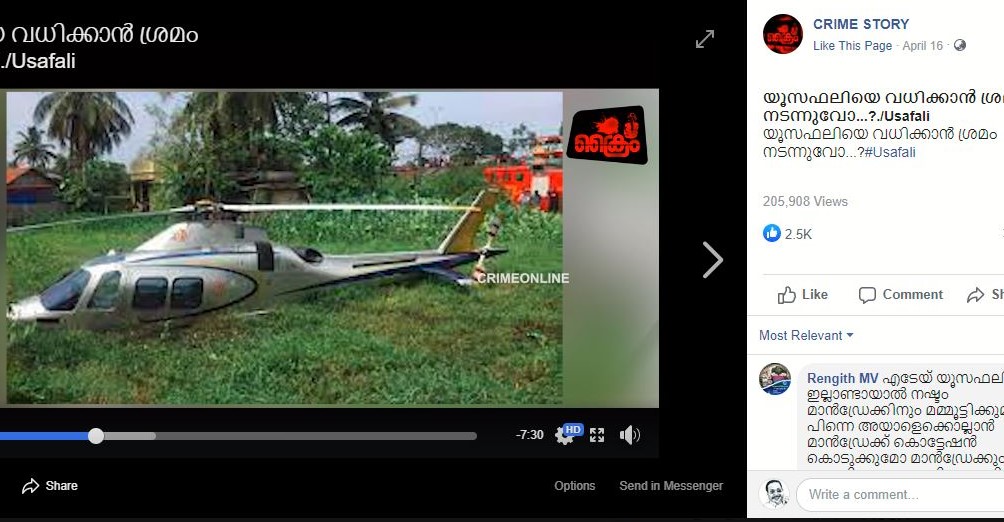 യൂസഫലിയെ വധിക്കാന് ശ്രമം നടന്നുവോ എന്ന പേരിൽ ഒരു വീഡിയോ ഫേസ്ബുക്കിൽ വൈറൽ ആയിട്ടുണ്ട്. അതിന് 2.5 k റീയാക്ഷൻസും 328 കമന്റുകളും 525 ഷെയറുകളും ഉണ്ട്.ഏപ്രിൽ 16നാണ് വീഡിയോ ആദ്യമായി ഫേസ്ബുക്കിൽ പ്രത്യക്ഷപ്പെടുന്നത്. എന്നാൽ പ്രമുഖ വ്യവസായിയും ലുലു ഗ്രൂപ്പ് ചെയർമാനും മാനേജിങ് ഡിറ്റക്ടറുമായ എം എ യൂസഫലിയെ അപായപ്പെടുത്താൻ ശ്രമം നടന്നുവെന്ന് ഈ വീഡിയോയിൽ ഒരു തെളിവും നല്കുന്നില്ല. ആകെ പറയുന്നത് കടവന്ത്രയിലെ വീട്ടിൽ നിന്നും പത്ത് കിലോമീറ്റർ മാത്രം ദൂരം ഉള്ള കൊച്ചി ലേക്ഷോർ ആശുപത്രിയിൽ ചികിത്സയിൽ കഴിയുന്ന ഒരു ബന്ധുവിനെ കാണാൻ ഹെലികോപ്റ്ററിൽ പോയതിലുള്ള ദുരൂഹതയാണ്. മറ്റൊന്ന് യൂസഫലി അപകടം കഴിഞ്ഞു കൊച്ചിയിൽ ചികിത്സ എടുക്കാതെ യു എ എയിൽ പോയി ശസ്ത്രക്രിയയ്ക്ക് വിധേയനായത് എന്ത് കൊണ്ട് എന്ന ചോദ്യമാണ്. യു എ ഇ നയതന്ത്ര പാക്കേജ് വഴി സ്വപ്ന സുരേഷുംസംഘവും സ്വർണം കടത്തിയ കേസിൽ യുസഫലിയ്ക്ക് എതിരെ എൻഫോഴ്സ്മെന്റ് അന്വേഷണം നടത്തുന്നുവെന്ന് ഒരു അഭ്യൂഹം കൂടി ഈ വീഡിയോയിൽ ഉൾപ്പെടുത്തിയിട്ടുണ്ട്.