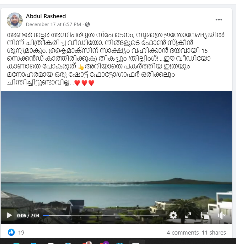 ഇന്തോനേഷ്യയിലെ സുമാത്രയിലെ വെള്ളത്തിനടിയിലെ അഗ്നിപർവ്വത സ്ഫോടനത്തിന്റെ ദൃശ്യങ്ങൾ എന്ന പേരിൽ പ്രചരിക്കുന്ന വിഡീയോ.