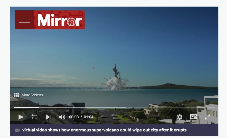 2017 ഒക്ടോബർ 11-ലെ Mirror ന്റെ ഒരു റിപ്പോർട്ടിൽ, ഇപ്പോൾ വ്യാപകമായി പ്രചരിക്കുന്ന ഫൂട്ടേജിലെ ഒരു ക്ലിപ്പുചെയ്ത പതിപ്പ് കാണാം. കൂടാതെ, റിപ്പോർട്ട് അഗ്നിപർവ്വത ശാസ്ത്രജ്ഞനായ പ്രൊഫസർ കോളിൻ വിൽസൺ ന്യൂസിലാന്റിലെ സൂപ്പർ അഗ്നിപർവ്വത സ്ഫോടനം ഉയർത്തിയേക്കാവുന്ന ഭീഷണിയെക്കുറിച്ച് നടത്തിയ ഗവേഷണത്തിന്റെ ഭാഗമായാണ് ഈ ദൃശ്യവൽക്കരണം സൃഷ്ടിച്ചതെന്ന് വിശദീകരിക്കുന്നു.