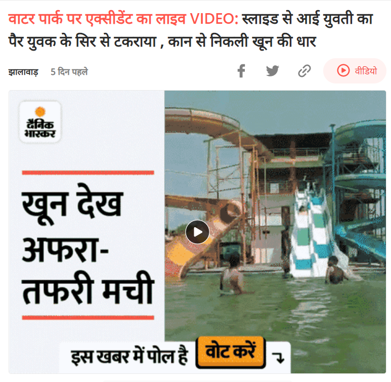 ഞങ്ങൾ ചില കീവേഡുകളുടെ സഹായത്തോടെ ഗൂഗിളിൽ തിരഞ്ഞു. അപ്പോൾ ജൂൺ അഞ്ചിന് ദൈനിക് ഭാസ്കർ പ്രസിദ്ധീകരിച്ച ഒരു റിപ്പോർട്ട് ഞങ്ങൾക്ക് ലഭിച്ചു. രാംഗഞ്ച് മാണ്ഡിയിൽ നിന്നുള്ള ഒരു യുവാവ് തന്റെ ചില സുഹൃത്തുക്കളോടൊപ്പം ജലവാറിലെ വാട്ടർ പാർക്കിൽ എത്തിയതായി റിപ്പോർട്ടിൽ പറയുന്നു. അവിടെ കുളത്തിൽ ഒരു യുവതി തെന്നിമാറി വെള്ളത്തിൽ നിന്ന യുവാവുമായി കൂട്ടിയിടിക്കുകയായിരുന്നു. ഇടി ശക്തമായതിനാൽ യുവാവിന്റെ തലയിൽ നിന്ന് രക്തം ഒഴുകാൻ തുടങ്ങി. റിപ്പോർട്ടുകൾ പ്രകാരം യുവാവിനെ ആശുപത്രിയിൽ എത്തിച്ചു. അവിടെ നിന്ന് ചികിത്സയ്ക്ക് ശേഷം ഡിസ്ചാർജ് ചെയ്തു.