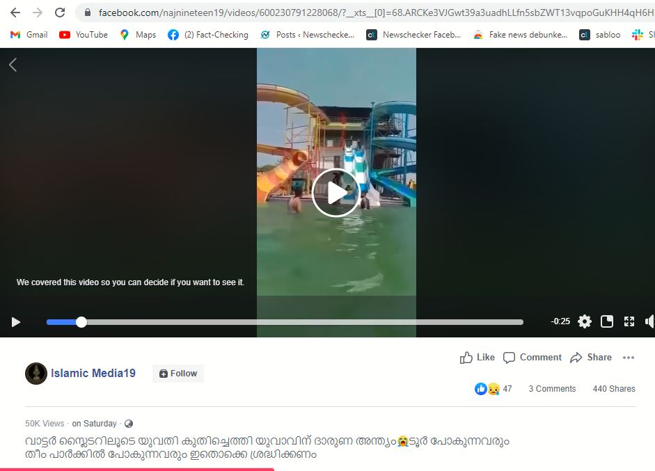 “നമ്മൾ എല്ലാം വിനോദ സഞ്ചാരത്തിന് പോവുമ്പോൾ വാട്ടർ സ്ളൈഡറിൽ വളരെ ഏറെ ശ്രദ്ധിക്കുക വെള്ളത്തിൽ ലാൻഡ് ആയി കഴിഞ്ഞാൽ സുരക്ഷിതസ്ഥാനത്തേക്ക് മാറുക വാട്ടർ സ്ളൈഡറിലൂടെ യുവതി കുതിച്ചെത്തി വന്നിടിച്ചു. യുവാവിന് ദാരുണാന്ത്യം,” എന്ന അവകാശപ്പെടുന്ന ഒരു പോസ്റ്റ്.