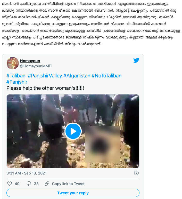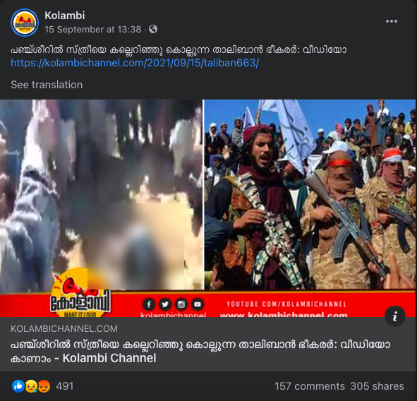 പഞ്ച്ശീറിൽ സ്ത്രീയെ കല്ലെറിഞ്ഞു കൊല്ലുന്ന താലിബാൻ (Taliban) ഭീകരർ, എന്ന പേരിൽ ഒരു പോസ്റ്റ് പ്രചരിക്കുന്നുണ്ട്.