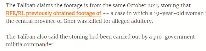 തുടർന്നുള്ള തിരച്ചിലിൽ rferl.org എന്ന സൈറ്റിലും ഈ വാർത്ത കണ്ടെത്തി. ഫെബ്രുവരി 3, 2020ലെ അവരുടെ റിപ്പോർട്ട് പറയുന്നു:ഒക്ടോബർ 2015 ലെ കല്ലേറിൽ നിന്നുള്ള ദൃശ്യങ്ങളാണിതെന്ന് താലിബാൻ അവകാശപ്പെടുന്നു. ഗോറിൽ 19 വയസ്സുള്ള ഒരു വ്യഭിചാര കുറ്റത്തിന് സ്ത്രീയെ കല്ലെറിഞ്ഞു കൊല്ലുന്നതാണ് ദൃശ്യത്തിലുള്ളത്, അവരുടെ റിപ്പോർട്ട് പറയുന്നു. ഈ സംഭവത്തിൽ തങ്ങൾക്ക് പങ്കില്ലെന്ന് താലിബാൻ പറഞ്ഞതായും rferl.org ന്റെ റിപ്പോർട്ടിൽ ഉണ്ട്.