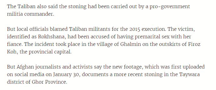 എന്നാൽ അഫ്ഗാൻ മാധ്യമപ്രവർത്തകരും ആക്ടിവിസ്റ്റുകളും പറയുന്നത്, ജനുവരി 30,2020 -ന് സോഷ്യൽ മീഡിയയിൽ ആദ്യം അപ്ലോഡ് ചെയ്ത ദൃശ്യങ്ങൾ, ഘോർ പ്രവിശ്യയിലെ തായ്വാര ജില്ലയിൽ അടുത്തിടെ നടന്നതാണ്, rferl.org റിപ്പോർട്ട് പറയുന്നു.