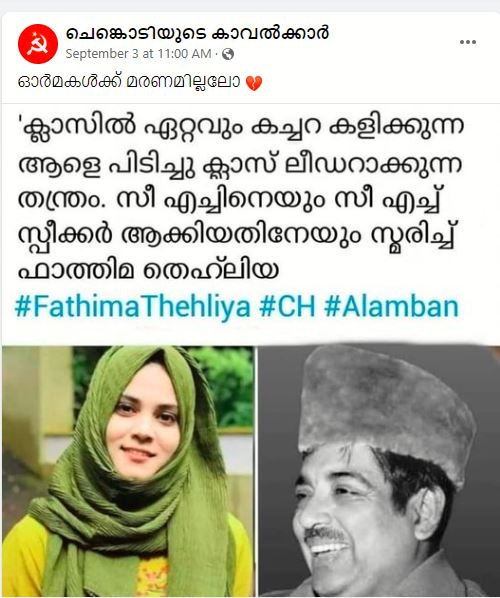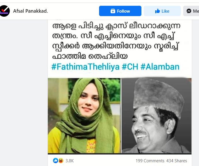 എംഎസ്എഫ് മുന് ദേശീയ വൈസ് പ്രസിഡന്റ് ഫാത്തിമ തഹ്ലിയ അന്തരിച്ച ലീഗ് നേതാവ് സി.എച്ച്. മുഹമ്മദ് കോയയെ വിമർശിക്കുന്നുവെന്ന പേരിൽ ഒരു പോസ്റ്റ് വൈറലാവുന്നുണ്ട്.