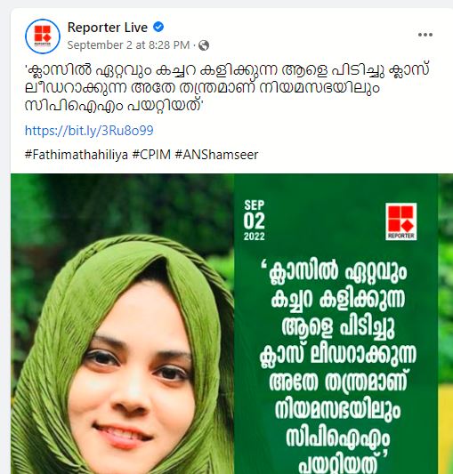 ”സിഎച്ചിനെയും സിഎച്ച് സ്പീക്കാറിയരുന്നതിനെയും സ്മരിച്ച് ഫാത്തിമ തഹ്ലിയ”എന്ന തലക്കെട്ടിലുള്ള റിപ്പോര്ട്ടര് ചാനലിന്റെ ന്യൂസ് കാർഡ് ഉപയോഗിച്ചാണ് പ്രചരണം.റിപ്പോർട്ടർ ടിവിയുടെ ന്യൂസ്കാർഡിനൊപ്പമല്ലാതെയും ഈ പോസ്റ്റ് വൈറലാവുന്നുണ്ട്.