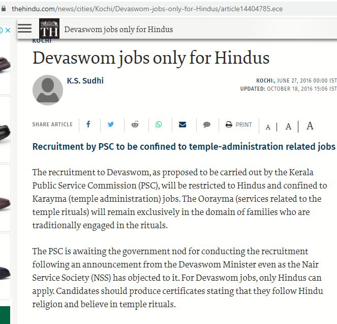 തുടർന്ന് ഞങ്ങൾ കീ വേർഡ് സേർച്ച് നടത്തിയപ്പോൾ 27, 2016ലെ ഹിന്ദു വാർത്ത കണ്ടു. അത് ദേവസ്വം നിയമനം പി എസ് സിയ്ക്ക് വിട്ടുന്നത് സംബന്ധിച്ചായിരുന്നു. അതിൽ കൃത്യമായി പറയുന്നത്, അങ്ങനെ വന്നാലും ഹിന്ദുക്കൾക്ക് മാത്രമേ ദേവസ്വം ജോലി കൊടുക്കൂ എന്നാണ്.