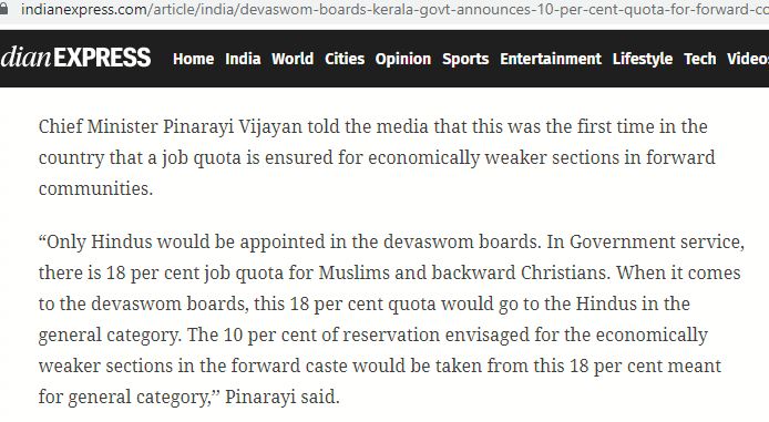 മുന്നോക്ക സമുദായങ്ങൾക്ക് ദേവസ്വത്തിൽ 10 ശതമാനം സംവരണം ഏർപ്പെടുത്തുന്നത് സംബന്ധിച്ചുള്ള നവംബർ 16, 2017 ലെ ഇന്ത്യൻ എക്സ്പ്രസ്സ് വാർത്തയിലും പറയുന്നത് ഹിന്ദുക്കൾക്ക് മാത്രമേ ദേവസ്വം ജോലി കൊടുക്കൂ എന്നാണ്.