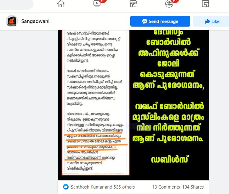 “ദേവസ്വം ബോർഡിൽ അഹിന്ദുക്കൾക്ക് ജോലി കൊടുക്കുന്നത് ആണ് പുരോഗമനം. വഖഫ് ബോർഡിൽ മുസ്ലിംകളെ മാത്രം നില നിർത്തുന്നത് ആണ് പുരോഗമനം. ഡബിൾസ്” എന്ന പേരിൽ ഒരു പോസ്റ്റ് ഫേസ്ബുക്കിൽ വൈറലാവുന്നുണ്ട്.