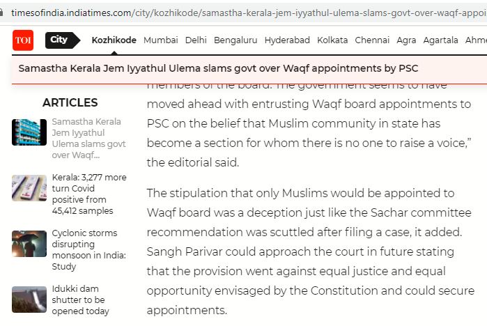 നവംബർ 13, 2021ലെ ടൈംസ് ഓഫ് ഇന്ത്യ വാർത്തയിൽ സമസ്ത കേരള ജെം ഇയ്യത്തുൽ ഉലമ, വഖഫ് ബോർഡ് നിയമനങ്ങൾ പി എസ് സിയ്ക്ക് വിടുന്നതിനു എതിർക്കാനുള്ള ഒരു കാരണമായി ചൂണ്ടി കാട്ടുന്നത് ദേവസ്വം ബോർഡ് നിയമനങ്ങൾ ഇപ്പോൾ ഒരു പ്രത്യേക ബോർഡിന്റെ കീഴിൽ ആണ് എന്നതാണ്. അത് കൊണ്ട് ദേവസ്വം ബോർഡ് നിയമനങ്ങളിൽ ഹിന്ദുക്കളെ മാത്രം ഉൾപ്പെടുത്താൻ കഴിയുന്നു.