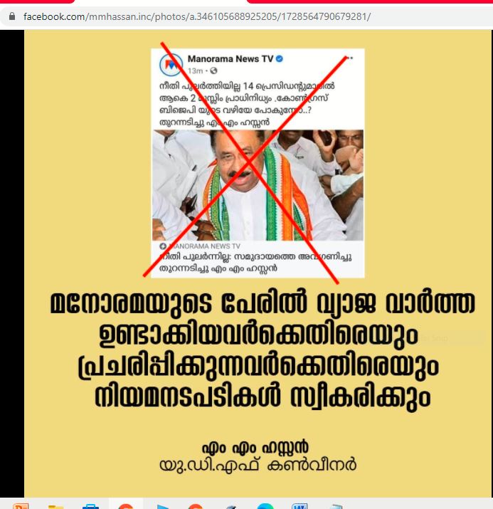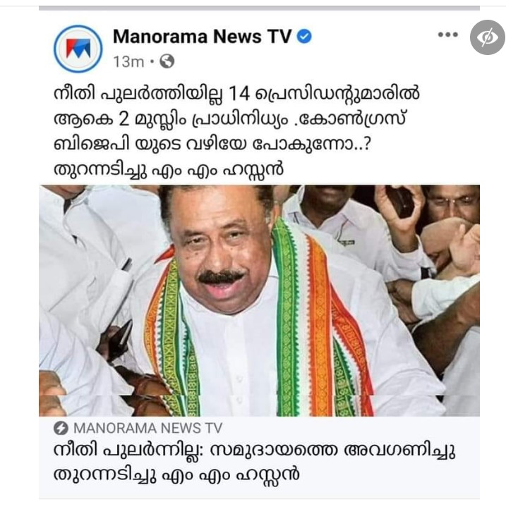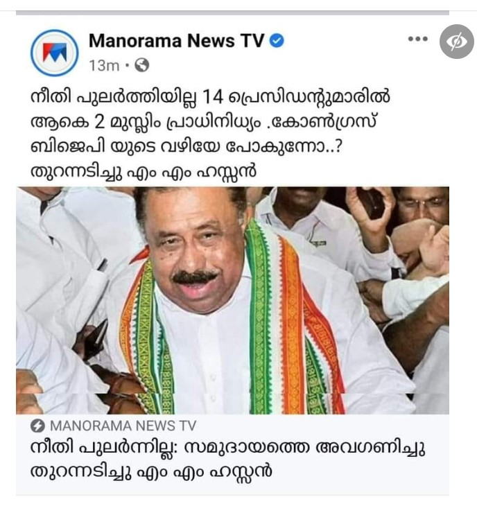 ഈ പശ്ചാത്തലത്തിലാണ്, ‘നീതി പുലർന്നില്ല. 14 പ്രസിഡന്റുമാരിൽ ആകെ 2 മുസ്ലിം പ്രാതിനിധ്യം. കോൺഗ്രസ് ബിജെപിയുടെ വഴിയേ പോകുന്നോ?തുറന്നടിച്ച് എം എം ഹസൻ.” എന്ന പേരിൽ ഒരു ന്യൂസ് കാർഡ് ഫേസ്ബുക്കിൽ പ്രത്യക്ഷപ്പെട്ടത്.