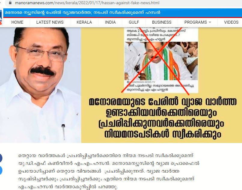 തുടർന്ന് മനോരമ ന്യൂസിന്റെ വെബ്സൈറ്റും സന്ദർശിച്ചു. അവരും ഈ വാർത്ത തെറ്റാണ് എന്ന് പ്രതികരിച്ചിട്ടുണ്ട്.”തെറ്റായ വാർത്തകൾ പ്രചരിപ്പിച്ചവർക്കെതിരെ നിയമ നടപടി സ്വീകരിക്കുമെന്ന് യു.ഡി.എഫ് കൺവീനർ എം.എം.ഹസൻ. മനോരമ ന്യൂസിന്റെ വ്യാജ പ്രൊഫൈൽ ഉപയോഗിച്ചാണ് തെറ്റായ വിവരങ്ങൾ പ്രചരിപ്പിക്കുന്നത്, എന്ന് മനോരമ ന്യൂസിന്റെ വാർത്ത പറയുന്നു.