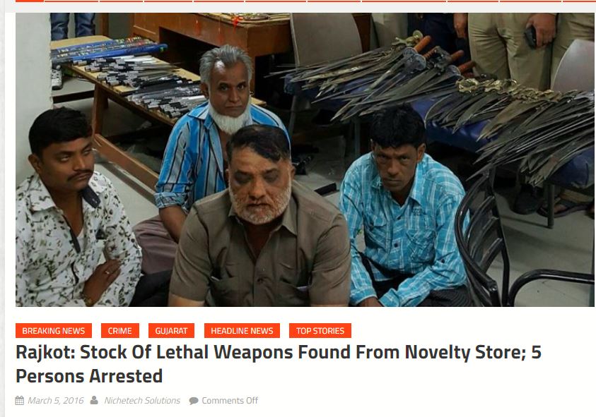 മാർച്ച് 5, 2016 ലെ വാർത്ത പറയുന്നത്,”ഗുജറാത്തിലെ രാജ്കോട്ടിൽ നിന്ന് ഒരു കടയിൽ നിന്ന് പിടികൂടിയ ആയുധ ശേഖരത്തിന്റെ ചിത്രമാണ് അത്.” എന്നാണ്.