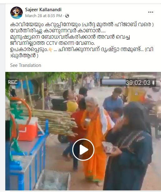 വീഡിയോയിലെ ദൃശ്യങ്ങൾ ഇങ്ങനെയാണ് ദരിദ്രനായ സന്യാസി റോഡിലൂടെ നടന്നു വരുന്നു. പലരോടും സഹായം അഭ്യർത്ഥിക്കുന്നു. ആരും സഹായിക്കുന്നില്ല. കരിമ്പിൻ ജ്യൂസ് കുടിക്കാനായി എത്തുന്ന പര്ദ്ദ ധരിച്ച സ്ത്രീ സന്യാസിയെ കകാണുന്നു. അവർ വാങ്ങിയ ജ്യൂസ് സന്യാസിക്ക് നൽക്കുന്നു. അദ്ദേഹത്തിന് കുറച്ച്, പണവും കൊടുക്കുന്നു. സിസിടിവി ക്യാമറയിൽ പതിഞ്ഞ ദൃശ്യങ്ങളാണിത് എന്ന് തോന്നിപ്പിക്കുന്ന വീഡിയോയുടെ അടിക്കുറിപ്പ് ഇങ്ങനെയാണ്:”കാവിയേയും കറുപ്പിനേയും (പർദ്ദ മുതൽ ഹിജാബ് വരെ ) വേർതിരിച്ചു കാണുന്നവർ കാണാൻ.മുനുഷ്യനെ ബോധവത്കരിക്കാൻ അവൻ വെച്ച ജീവനില്ലാത്ത CCTV തന്നെ വേണം.ഉപകാരപ്പെടും.”