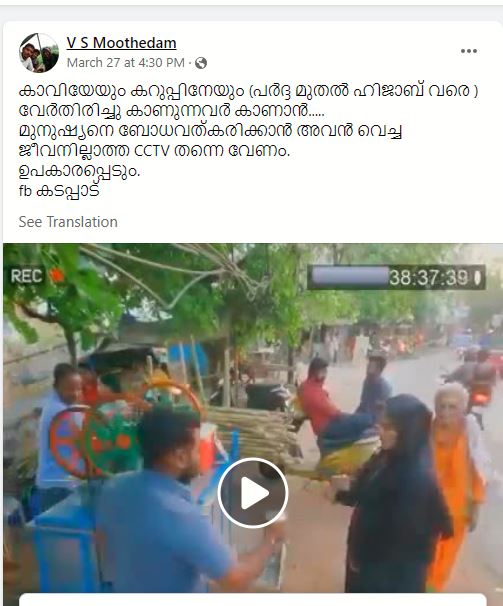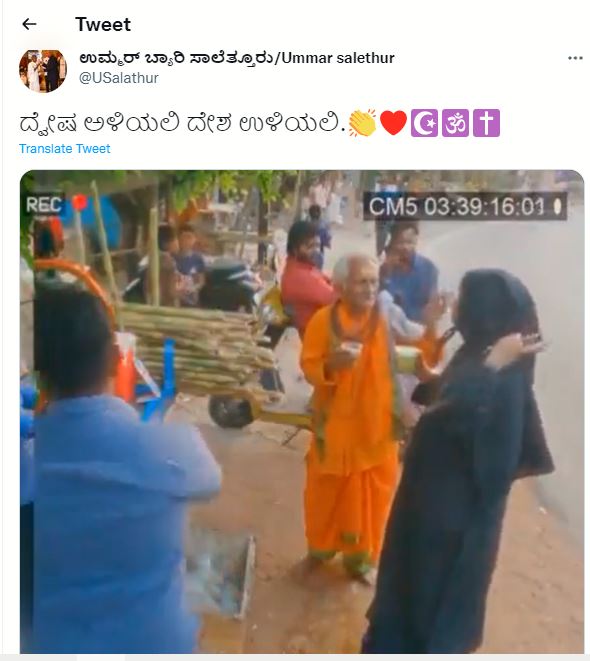 കാവി വസ്ത്രം ധരിച്ച സന്ന്യാസിയെ ഹിജാബ് ധരിച്ച സ്ത്രീ സഹായിക്കുന്നതാണ് വീഡിയോ ഫേസ്ബുക്കിൽ വൈറലാവുന്നുണ്ട്.