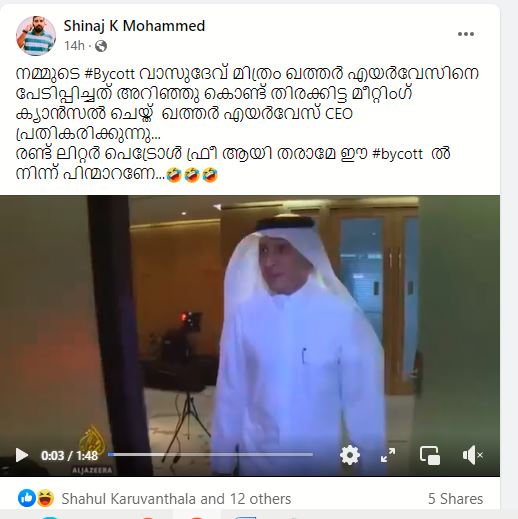 #BoycottQatar ട്രെൻഡിന്റെ ഭാഗമായി ഇന്റർനെറ്റിൽ ഏറ്റവുമധികം ഷെയർ ചെയ്യപ്പെട്ട വീഡിയോകളിലൊന്ന് ബഹിഷ്കരണ ആഹ്വാനത്തെ കുറിച്ച് അൽ ജസീറ ന്യൂസ് ചാനലുമായി ഖത്തർ എയർവേയ്സ് സിഇഒ നടത്തിയ അഭിമുഖം എന്ന പേരിൽ പ്രചരിക്കുന്ന വീഡിയോയാണ്.