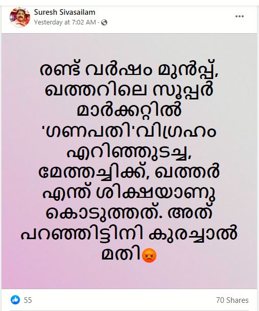 മലയാളത്തിൽ ഈ പടം ഉപയോഗിക്കാതെ, ”ഖത്തറിലെ സൂപ്പർ മാർക്കറ്റിൽ ‘ഗണപതി’വിഗ്രഹം എറിഞ്ഞുടച്ച, മേത്തച്ചിക്ക്, ഖത്തർ എന്ത് ശിക്ഷയാണു കൊടുത്തത്. അത് പറഞ്ഞിട്ടിനി ഖത്തർ കൂടുതൽ കുരച്ചാൽ മതി,” എന്ന് പറയുന്ന ഒരു പോസ്റ്റ് വൈറലാവുന്നുണ്ട്.