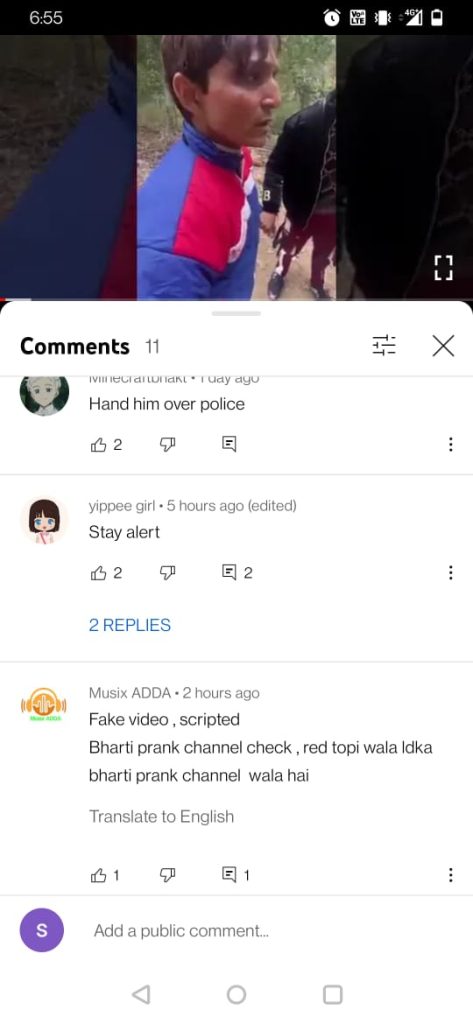കമന്റ് സെക്ഷൻ വിശകലനം ചെയ്യുമ്പോൾ, പോസ്റ്റ് വ്യാജമാണെന്ന് വ്യക്തമാക്കുന്ന ഒരു കമന്റ് ഞങ്ങൾ ശ്രദ്ധിച്ചു. കൂടാതെ വീഡിയോ പോസ്റ്റ് ചെയ്തിരിക്കുന്നത് ഭാരതി പ്രാങ്ക് എന്ന ഫേസ്ബുക്ക് പേജിലാണെന്നും ചുവന്ന തൊപ്പി ധരിച്ച് കാണുന്നയാളാണ് പേജ് പ്രവർത്തിപ്പിക്കുന്നതെന്നും കമന്റിൽ പറയുന്നു.