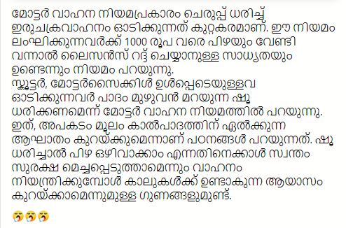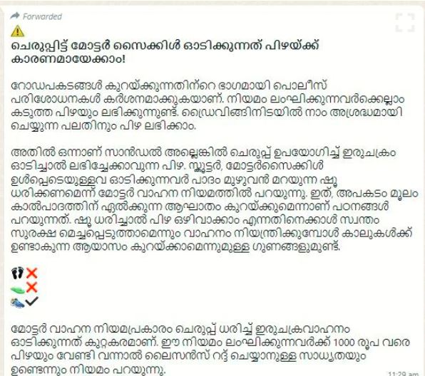 സ്കൂട്ടർ, മോട്ടർസൈക്കിൾ ഉൾപ്പെടെയുള്ളവ ഓടിക്കുന്നവർ പാദം മുഴുവൻ മറയുന്ന ഷൂ ധരിക്കണമെന്ന് മോട്ടർ വാഹന നിയമത്തിൽ പറയുന്നു. ഇത്, അപകടം മൂലം കാൽപാദത്തിന് ഏൽക്കുന്ന ആഘാതം കുറയ്ക്കുമെന്നാണ് പഠനങ്ങൾ പറയുന്നത്. ഷൂ ധരിച്ചാൽ പിഴ ഒഴിവാക്കാം എന്നതിനെക്കാൾ സ്വന്തം സുരക്ഷ മെച്ചപ്പെടുത്താമെന്നും വാഹനം നിയന്ത്രിക്കുമ്പോൾ കാലുകൾക്ക് ഉണ്ടാകുന്ന ആയാസം കുറയ്ക്കാമെന്നുമുള്ള ഗുണങ്ങളുമുണ്ട്,” എന്നാണ് പ്രചരിക്കുന്ന സന്ദേശം.വാട്ട്സ്ആപ്പിലാണ് കുടുതലും ഈ പ്രചരണം പ്രധാനമായും നടക്കുന്നത്.
