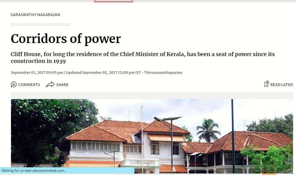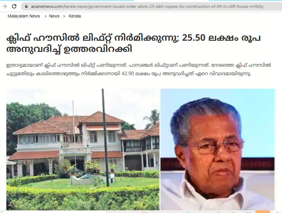 “മുഖ്യമന്ത്രിയുടെ ഓദ്യോഗിക വസതിയായ ക്ലിഫ് ഹൗസിൽ ലിഫ്റ്റ് പണിയാൻ 25.50 ലക്ഷം രൂപ അനുവദിച്ച് പൊതുമരാമത്ത് വകുപ്പിന്റെ ഉത്തരവ്. ഇതാദ്യമായാണ് ക്ലിഫ് ഹൗസിൽ ലിഫ്റ്റ് പണിയുന്നത്. പാസഞ്ചർ ലിഫ്റ്റാണ് പണിയുന്നത്. നേരത്തെ ക്ലിഫ് ഹൗസില് ചുറ്റുമതിലും കാലിത്തൊഴുത്തും നിർമ്മിക്കാനായി 42.90 ലക്ഷം രൂപ അനുവദിച്ചത് ഏറെ വിവാദമായിരുന്നു. ചെലവ് ചുരുക്കണമെന്ന ധനവകുപ്പിന്റെ നിർദ്ദേശം നിലനിൽക്കെയാണ് ക്ലിഫ് ഹൗസിൽ ലിഫ്റ്റ് പണിയാനുള്ള തീരുമാനം,” എന്നാണ് വാർത്ത പറയുന്നത്. അതിനൊപ്പം ക്ലിഫ് ഹൗസിന്റെ പടവും കൊടുത്തിട്ടുണ്ട്, അതിൽ നിന്നും കെട്ടിടം രണ്ടു നിലയാണ് എന്ന് മനസിലാക്കാം.