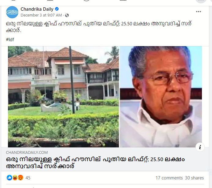 ”ഒരു നിലയുള്ള ക്ലിഫ് ഹൗസ് എന്ന കേരള മുഖ്യമന്ത്രിയുടെ ഔദ്യോഗിക വസതിയ്ക്ക് പുതിയ ലിഫ്റ്റ് നിർമ്മിക്കുന്നതിനായി 25.50 ലക്ഷം അനുവദിച്ച് സർക്കാർ,” എന്ന പേരിൽ ഒരു പോസ്റ്റ് വൈറലാവുന്നുണ്ട്. നേരത്തെ ക്ലിഫ് ഹൗസില് ചുറ്റുമതിലും കാലിത്തൊഴുത്തും നിര്മ്മിക്കാനായി 42.90 ലക്ഷം രൂപ അനുവദിച്ചത് ഏറെ വിവാദമായിരുന്നു.