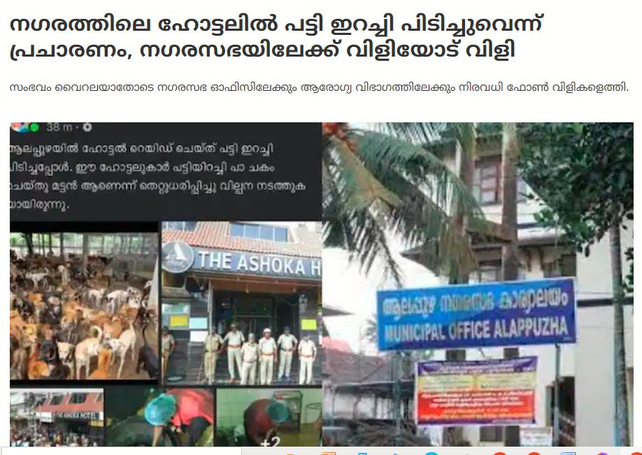 ഞങ്ങൾ ഒരു കീ വേർഡ് സേർച്ച് ചെയ്തപ്പോൾ, ഏഷ്യാനെറ്റ് ന്യൂസിന്റെ ഒരു വാർത്ത കിട്ടി.’ നഗരത്തിലെ ഹോട്ടലില് ആരോഗ്യവകുപ്പിന്റെ നേതൃത്വത്തില് നടത്തിയ പരിശോധനയിൽ പട്ടിയിറച്ചി പിടി കൂടിയെന്ന് വ്യാജ പ്രചരണം.വാട്സ് ആപ് അടക്കമുള്ള സാമൂഹ്യ മാധ്യമങ്ങളിലൂടെയായിരുന്നു ചിത്രങ്ങൾ സഹിതം പ്രചരണം. സംഭവം വൈറലയാതോടെ നഗരസഭ ഓഫിസിലേക്കും ആരോഗ്യ വിഭാഗത്തിലേക്കും നിരവധി ഫോൺ വിളികളെത്തി. സംഭവം വ്യാജ വാർത്തയാണെന്നും ‘ദി അശോക ഹോട്ടൽ’ എന്നപേരിൽ ആലപ്പുഴയിൽ ഹോട്ടൽ പ്രവർത്തിക്കുന്നില്ലെന്നും അധികൃതർ വ്യക്തമാക്കി,” വാർത്ത പറയുന്നു.