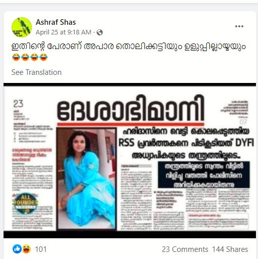 ഈ സാഹചര്യത്തിലാണ്, “ഹരിദാസിനെ കൊലപ്പെടുത്തിയ ആര്എസ്എസ് പ്രവര്ത്തകനെ പിടികൂടിയത് ഡിവൈഎഫ്ഐ അധ്യാപികയുടെ തന്ത്രത്തിലൂടെ. തന്ത്രത്തിലൂടെ സ്വന്തം വീട്ടില് വിളിച്ചു വരുത്തി പോലീസിനെ അറിയിക്കുകയായിരുന്നു.”എന്നിങ്ങനെ പറയുന്ന വാർത്തയുള്ള സിപിഎം മുഖപത്രമായ ദേശാഭിമാനിയുടെ കണ്ണൂർ എഡിഷന്റെ ഏപ്രിൽ 23ലെ പത്രം എന്ന പേരിൽ ഒരു പടം ഫേസ്ബുക്കിൽ പ്രചരിക്കുന്നത്. Ashraf Shas എന്ന ഐഡിയിൽ നിന്നുള്ള ഇത്തരം ഒരു പോസ്റ്റ് ഞങ്ങൾ പരിശോധിച്ചപ്പോൾ അതിന് 144 ഷെയറുകൾ ഉണ്ടായിരുന്നു.