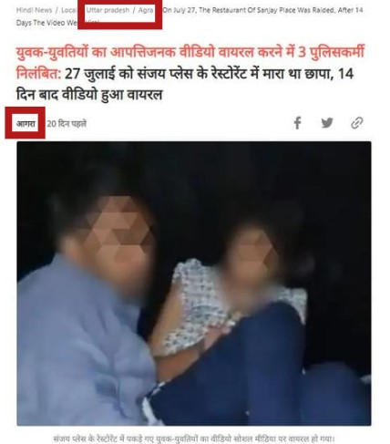 ആഗസ്റ്റ് 27ന് ഹരിപർവത്ത് പോലീസ് സ്റ്റേഷനിലെ ഹെഡ് കോൺസ്റ്റബിളായ രഞ്ജിത്തും മറ്റ് രണ്ട് കോൺസ്റ്റബിൾമാരും സഞ്ജയ് പ്ലേസിലെ ഒരു കഫേയിൽ റെയ്ഡ് നടത്തിയതായി റിപ്പോർട്ടിൽ പറയുന്നു. ഇവരിൽ രണ്ടുപേർ കഫേയുടെ ബേസ്മെന്റിലേക്ക് അതിക്രമിച്ച് കയറി. അവിടെ ചില യുവ ദമ്പതികളെ ആക്ഷേപകരമായ സാഹചര്യത്തിൽ, കണ്ടെത്തി. മൂന്നാമൻ വീഡിയോ ചിത്രീകരിച്ചു. മുഴുവൻ റെയ്ഡിന്റെയും വീഡിയോ സോഷ്യൽ മീഡിയ പ്ലാറ്റ്ഫോമുകളിൽ എത്തിയതോടെ നിരവധി പേർ പോലീസിന് നേരെ ആക്ഷേപം ഉന്നയിച്ചു. ഇതേത്തുടർന്ന് ആഗ്ര എസ്എസ്പി പ്രഭാകർ ചൗധരി റെയ്ഡിൽ പങ്കെടുത്ത മൂന്ന് കോൺസ്റ്റബിൾമാരെ സസ്പെൻഡ് ചെയ്തു.