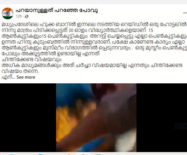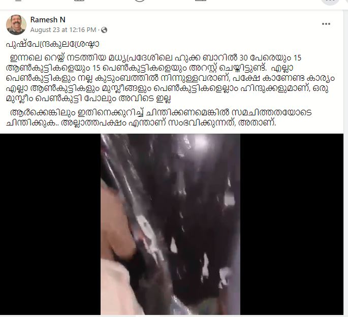 ഇന്നലെ റെയ്ഡ് നടത്തിയ മധ്യപ്രദേശിലെ ഹുക്ക ബാറിൽ 30 പേരെ അറസ്റ്റ് ചെയ്തുവെന്ന് അവകാശപ്പെടുന്ന ഒരു വീഡിയോ വൈറലാവുന്നുണ്ട്. വർഗീയമായ ഉള്ളടക്കത്തോടെയാണ് വീഡിയോ വൈറലാവുന്നത്.