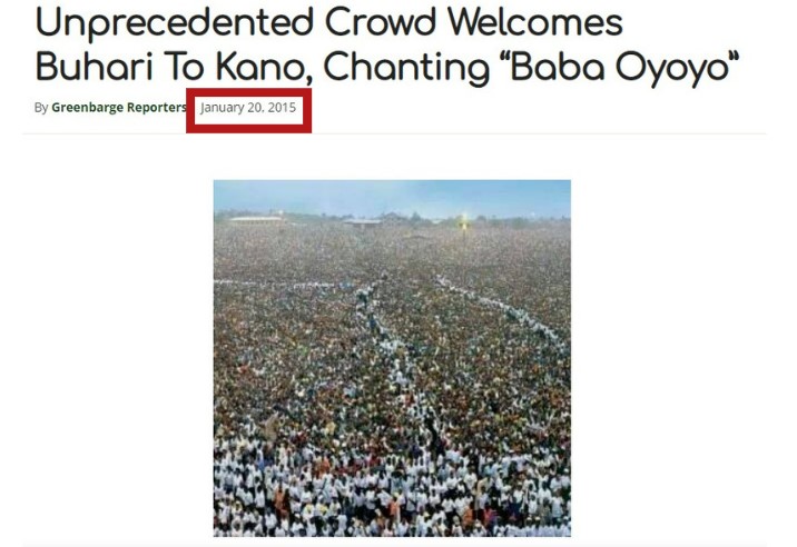 വൈറലായ ചിത്രം കൊടുത്ത റിപ്പോർട്ട് ഇങ്ങനെയാണ് പറയുന്നത്. , “അഭൂതപൂർവമായ ജനക്കൂട്ടം, ഇന്ന്, ഓൾ പ്രോഗ്രസീവ് കോൺഗ്രസിന്റെ (എപിസി) പ്രസിഡന്റ് സ്ഥാനാർത്ഥി ജനറൽ മുഹമ്മദു ബുഹാരിയെ കാനോ സംസ്ഥാനത്തിന്റെ തലസ്ഥാനമായ കാനോയിലേക്ക് ആനയിച്ചു: “സായി ബുഹാരി, ബാബ ഒയോയോ” എന്ന ഗാനങ്ങൾക്കൊപ്പമാണ് അദ്ദേഹത്തെ ആനയിച്ചത്. ”