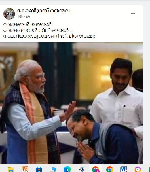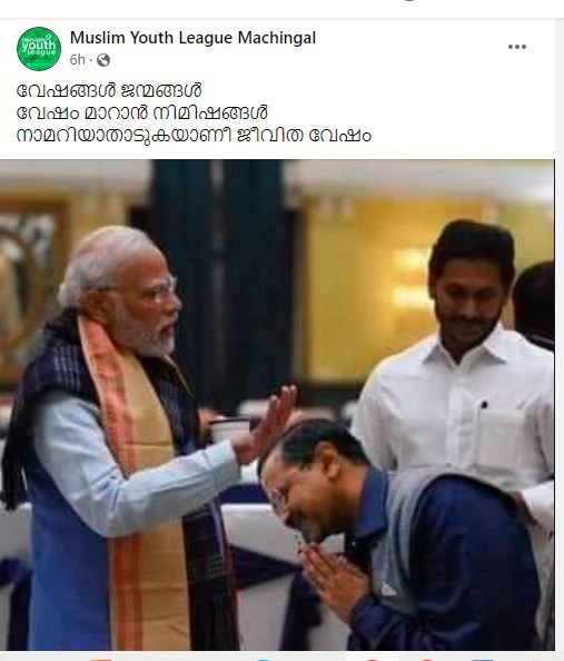 “ബിജെപി യുടെ തളർച്ച കണ്ടാൽ അവിടെ ഉണ്ടാവും ആപ്പ്. തളർത്താനല്ല വളർത്താൻ,” എന്ന വിവരണത്തോടെ, “ഉടമ കുനിയാൻ പറഞ്ഞാൽ അടിമ മുട്ടിലിഴയും,” എന്ന് ഒരു വാക്യം ഫോട്ടോയിൽ സൂപ്പർഇമ്പോസ് ചെയ്താണ് പ്രചരിപ്പിക്കുന്നത്.