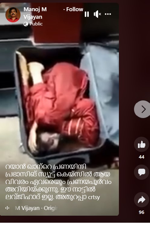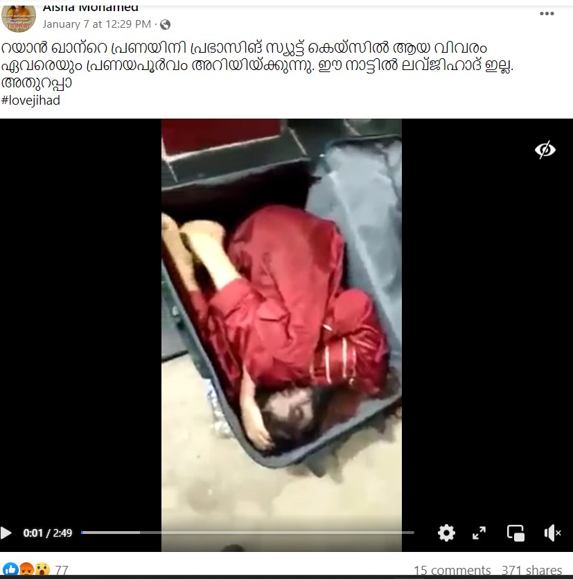 വീഡിയോയിൽ, ഒരു ആൺകുട്ടി, ഒരു പെൺകുട്ടിയുടെ മൃതദേഹം ഉള്ള ഒരു നീല സ്യൂട്ട്കേസിനടുത്തായി ഇരിക്കുന്നത് കാണാം. സംഭവം ക്യാമറയിൽ പകർത്തിയ ആൾ, “ഈ ആൺകുട്ടി പെൺകുട്ടിയെ കൊന്ന് അവളുടെ ശരീരം സ്യൂട്ട്കേസിൽ തിരുകിയിരിക്കുന്നു,” എന്ന് പറയുന്നതും കേൾക്കാം. “റയാൻ ഖാന്റെ പ്രണയിനി പ്രഭാസിങ് സ്യുട്ട് കെയ്സിൽ ആയ വിവരം ഏവരെയും പ്രണയപൂർവം അറിയിയ്ക്കുന്നു. ഈ നാട്ടിൽ ലൗ ജിഹാദ് ഇല്ല. അതുറപ്പാ,#lovejihad,”എന്നാണ് വീഡിയോയ്ക്ക് ഒപ്പമുള്ള വിവരണം.