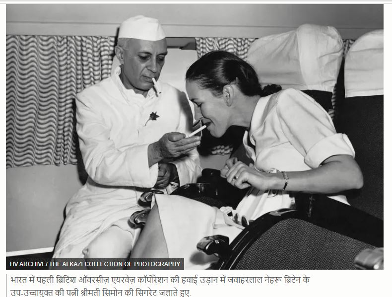 ഈ ചിത്രം ഹോമി വ്യരാവാല എന്ന ഫോട്ടോഗ്രാഫർ എടുത്തതാണ്. ബ്രിട്ടീഷ് ഓവര്സീസ് എയര്വെസ് കോര്പറേഷന്റെ ഇന്ത്യയിലേക്കുള്ള ആദ്യത്തെ വിമാനത്തിൽ ബ്രിട്ടിഷ് രാജദൂതന്റെ ഭാര്യ സിമോണിന് സിഗരറ്റ് കത്തിച്ച് കൊടുക്കുന്ന നെഹ്റുവിന്റെ ഫോട്ടോയാണിത്. ഈ വനിതാ ഫോട്ടോഗ്രാഫറിന്റെ ഫോട്ടോയെ കുറിച്ചുള്ള ഡിസംബർ 12 ,2017 ലെ ബി ബി സി ഹിന്ദിയുടെ റിപ്പോർട്ടിൽ ഫോട്ടോയുണ്ട്.