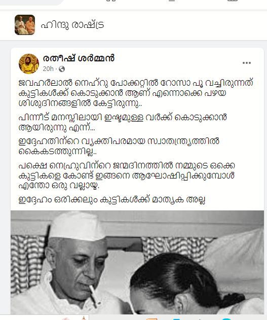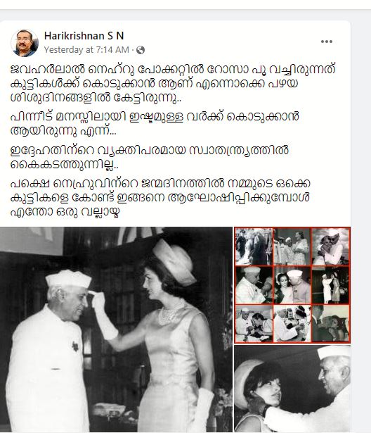 ” ജവഹർലാൽ നെഹ്റു പോക്കറ്റിൽ റോസാ പൂ വച്ചിരുന്നത് കുട്ടികൾക്ക് കൊടുക്കാൻ ആണ് എന്നൊക്കെ പഴയ ശിശുദിനങ്ങളിൽ കേട്ടിരുന്നു. പിന്നീട് മനസ്സിലായി ഇഷ്ടമുള്ളവർക്ക് കൊടുക്കാൻ ആയിരുന്നു എന്ന്. ഇദ്ദേഹതിന്റെ വ്യക്തിപരമായ സ്വാതന്ത്ര്യത്തിൽ കൈകടത്തുന്നില്ല. പക്ഷെ, നെഹ്റുവിന്റെ ജന്മദിനത്തിൽ നമ്മുടെ ഒക്കെ കുട്ടികളെ കൊണ്ട് ഇങ്ങനെ ആഘോഷിപ്പിക്കുമ്പോൾ എന്തോ ഒരു വല്ലായ്മ. ഇദ്ദേഹം ഒരിക്കലും കുട്ടികൾക്ക് മാതൃക അല്ല.” എന്ന വാചകത്തോടൊപ്പമാണ് പോസ്റ്റുകൾ ഷെയർ ചെയ്യപ്പെടുന്നത്. Adv.harikrishnan എന്ന ഐഡിയിൽ നിന്നുമുള്ള പോസ്റ്റ് ഞങ്ങൾ കണ്ടപ്പോൾ അതിന് 59 ഷെയറുകൾ ഉണ്ടായിരുന്നു.