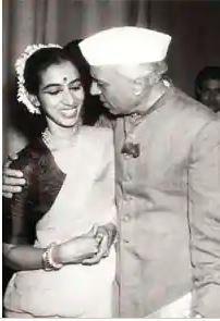 ഐ.എസ്.ആര്.ഓ. ശാസ്ത്രജ്ഞന് വിക്രം സാരാഭായിയുടെ ഭാര്യയും നർത്തകിയുമായ മൃണാളിനി സാരാഭായിയാണ് ജവഹർലാൽ നെഹ്റുവിനൊപ്പം ചിത്രത്തിൽ ഉള്ളത്. ഡല്ഹിയില് നടന്ന മാനുഷ്യ എന്ന നൃത്യ പരിപാടി കഴിഞ്ഞപ്പോൾ നെഹ്റു മൃണാളിനിയെ അഭിനന്ദിക്കുന്ന ഈ പടം മിന്റ് നവംബർ 19 2009ൽ ഒരു ലേഖനത്തിൽ കൊടുത്തിട്ടുണ്ട്.