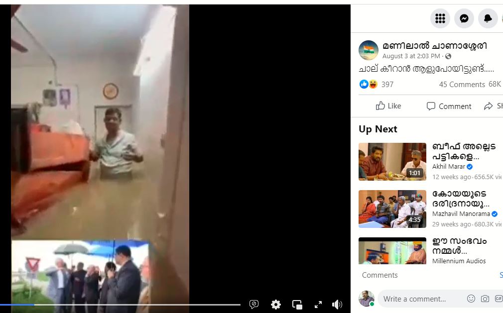 പ്രളയത്തിൽ മുങ്ങിപോയ വീടിന്റെ ദൃശ്യങ്ങൾ കേരളത്തിൽ നിന്നുള്ളത് എന്ന പേരിൽ ഷെയർ ചെയ്യപ്പെടുന്നുണ്ട്. വീട് സാധനങ്ങള് എടുത്തുകൊണ്ട് ഒരു വീട്ടമ്മയെയും ഗൃഹനാഥനും നിൽക്കുന്നതാണ് വീഡിയോ. വീഡിയോയിൽ, നിർദിഷ്ട കെ-റെയിൽ, വാട്ടർ മെട്രോ പദ്ധതികൾ നിലവിലെ മെട്രോ റെയിൽ പദ്ധതിയുമായി സമന്വയിപ്പിക്കുന്നതിനെ കുറിച്ച് മുഖ്യമന്ത്രി പിണറായി വിജയൻ നടത്തുന്ന ഒരു പ്രസംഗത്തിന്റെ ഓഡിയോ ചേർത്തിട്ടുണ്ട്.