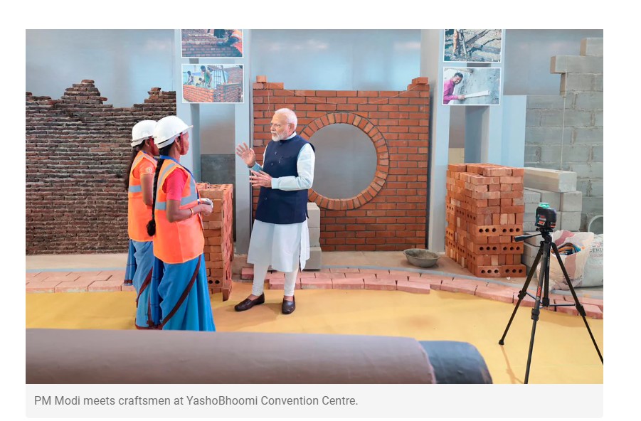 വിശ്വകർമ ജയന്തിയോട് അനുബന്ധിച്ച് പ്രധാനമന്ത്രി നരേന്ദ്ര മോദി ഡൽഹിയിലെ ദ്വാരകയിലെ ഇന്ത്യാ ഇന്റർനാഷണൽ കൺവെൻഷൻ ആൻഡ് എക്സ്പോ സെന്ററിൽ (യശോഭൂമി) നടന്ന കരകൗശല മേള സന്ദര്ശിച്ച വേളയിൽ കരകൗശല വിദഗ്ധരെ കണ്ട് ആശയവിനിമയം നടത്തുന്ന ഫോട്ടോ ആണിത്.