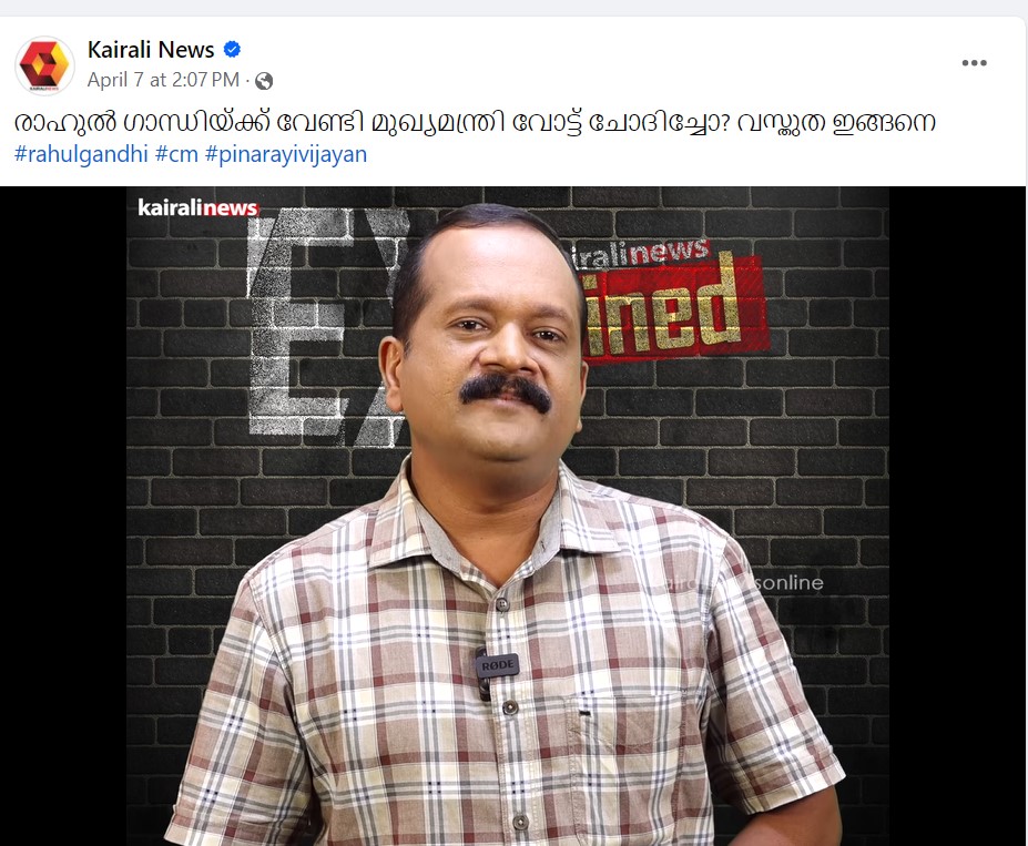 “രാഹുൽ ഗാന്ധിയ്ക്ക് വേണ്ടി മുഖ്യമന്ത്രി വോട്ട് ചോദിച്ചോ? വസ്തുത ഇങ്ങനെ,” എന്ന തലക്കെട്ടിൽ ഇപ്പോൾ വൈറലായിരിക്കുന്ന വീഡിയോയിൽ പ്രചരിക്കുന്ന പ്രസംഗത്തിന്റെ ഭാഗത്തിന് മുൻപും ശേഷവും ഉള്ള ഭാഗങ്ങൾ കൂടി ഉൾപ്പെടുത്തി പിണറായി വിജയൻ എന്താണ് കട്ടപ്പനയിൽ പറഞ്ഞത് എന്ന് വിശദീകരിക്കുന്ന ഒരു വീഡിയോ Kairali News ഫേസ്ബുക്കിൽ ഏപ്രിൽ 7,2024ന് പോസ്റ്റ് ചെയ്തതും ഞങ്ങൾ കണ്ടെത്തി.