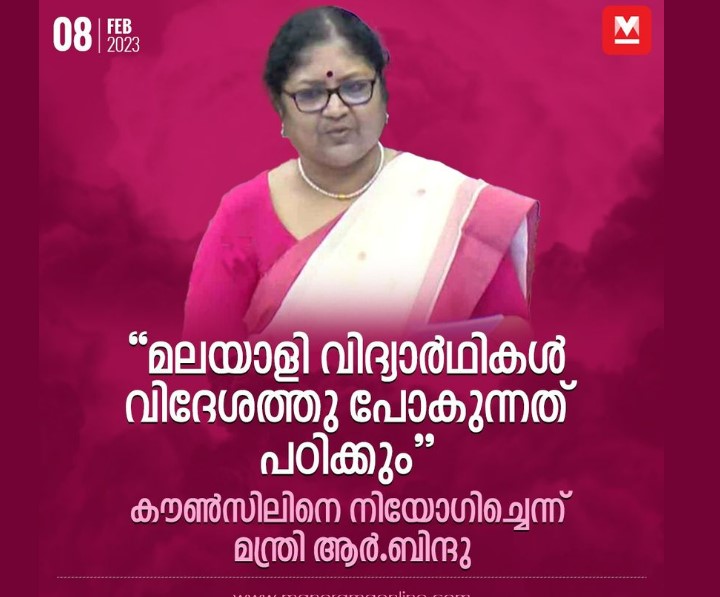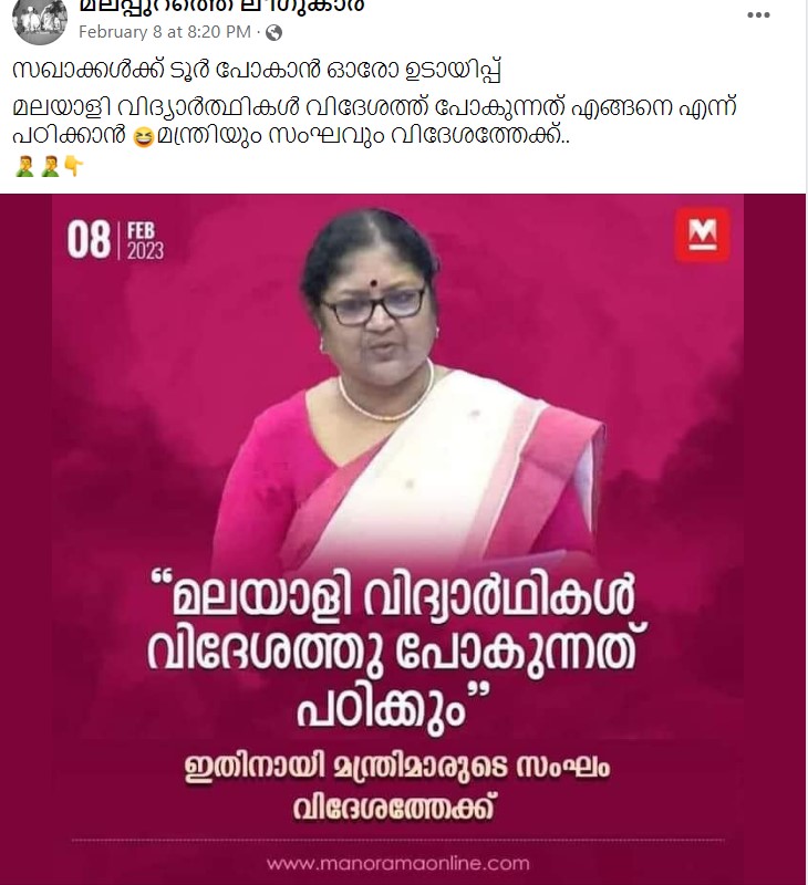 ‘മലയാളി വിദ്യാര്ഥികള് വിദേശത്തു പോകുന്നത് പഠിക്കും’, ‘ ഇതിനായി മന്ത്രിമാരുടെ സംഘം വിദേശത്തേയ്ക്ക്,’എന്ന് മന്ത്രി ആർ ബിന്ദു പറയുന്നതായി അവകാശപ്പെടുന്ന മനോരമ ഓൺലൈനിന്റെ ന്യൂസ്കാർഡ് ഉപയോഗിച്ചുള്ള പ്രചരണം.
