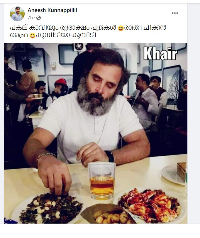 “പകൽ കാവി, രുദ്രാക്ഷം, പൂജകൾ, രാത്രി ചിക്കൻ ഫ്രൈ, കുമ്പിടിയാ, കുമ്പിടി,” എന്നാണ് പോസ്റ്റിലെ വരികൾ.മലയാളി പ്രേക്ഷകരെ എന്നും പൊട്ടിച്ചിരിപ്പിച്ചിട്ടുള്ള താരമായ ജഗതി ശ്രീകുമാര്, നന്ദനം സിനിമയിൽ അവതരിപ്പിച്ച കഥാപാത്രത്തിന്റെ പേരാണ് കുമ്പിടി. രാവിലെ മുഴുവൻ സന്ന്യാസി വേഷത്തിൽ നടക്കുകയും ഒളിച്ചിരുന്ന് ചിക്കൻ കഴിക്കുകയും ചെയ്യുന്ന ഒരു കഥാപാത്രമാണിത്.