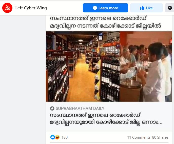 വഖഫ് ബോർഡ് നിയമനങ്ങൾ പിഎസ്സിക്ക് വിടാൻ എൽഡിഎഫ് നീക്കം നടത്തുന്നുവെന്ന് ആരോപിച്ചു Muslim League കോഴിക്കോട് December 9 നു റാലി നടത്തിയിരുന്നു. ആ ദിവസം കോഴിക്കോട് ജില്ലയില് റെക്കോഡ് മദ്യവില്പന നടന്നുവെന്ന രീതിയിൽ ഒരു പ്രചരണം നടക്കുന്നുണ്ട്. സുപ്രഭാതം ദിനപത്രത്തില് വന്ന വാര്ത്തയുടെ സ്ക്രീന്ഷോട്ട് എന്ന രീതിയിൽ ഒരു പടം കൊടുത്തു കൊണ്ടാണ് പ്രചരണം.