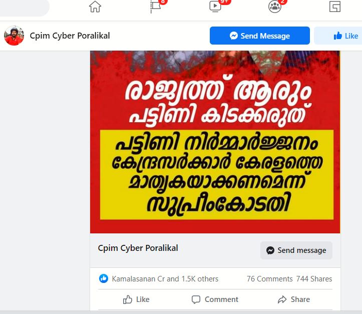 Cpim Cyber Poralikal എന്ന ഐഡിയിൽ നിന്നുമുള്ള പോസ്റ്റ് ഞങ്ങൾ കണ്ടപ്പോൾ അതിനു 744 ഷെയറുകൾ ഉണ്ടായിരുന്നു.