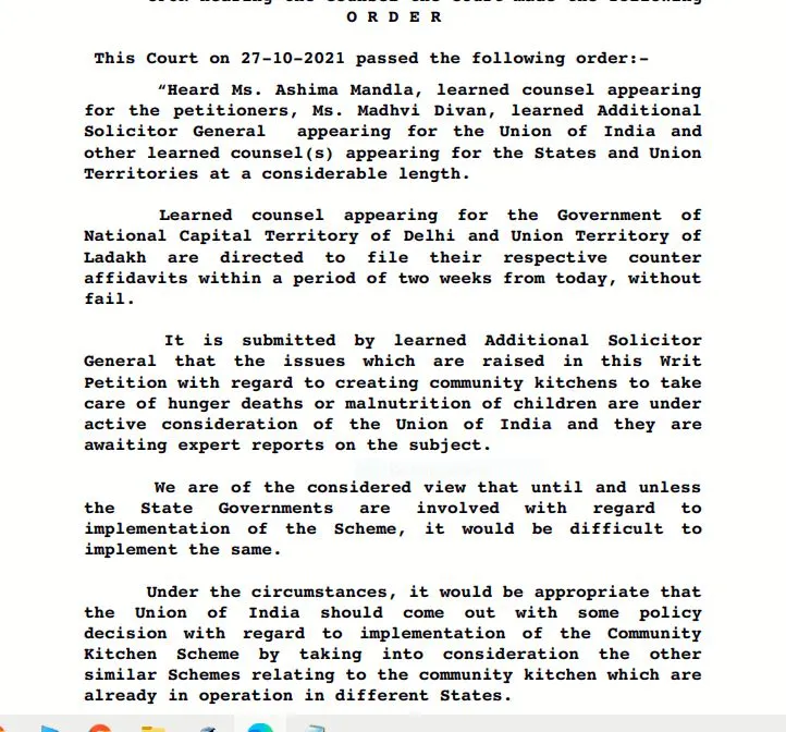 ക്ഷേമരാഷ്ട്രത്തിൽ പട്ടിണിമരണം ഉണ്ടാകാൻ പാടില്ല എന്ന് പറഞ്ഞതിന് ശേഷം, കോടതി കമ്മ്യൂണിറ്റി കിച്ചൻ ആരംഭിക്കാൻ കേന്ദ്ര സർക്കാരിന് നിർദേശം നൽകിയെന്നാണ് അതിൽ നിന്നും മനസിലായത്. അനൂൻ ധവാൻ നൽകിയ ഹർജിയിലാണ് ഈ വിധി.