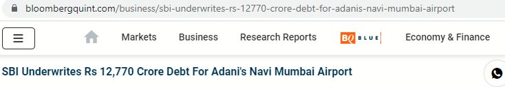 അദാനിക്കുവേണ്ടി നവി മുംബൈ എയർപോർട്ടിന്റെ 12770 കോടി കടം എഴുതിത്തള്ളുകയല്ല S.B.I ചെയ്തത്. വിമാനത്താവളം ഏറ്റെടുക്കാൻ ആവശ്യമായ ധനലഭ്യത ഉറപ്പ് വരുത്തുന്ന under writing എന്ന പ്രക്രിയയാണ് S.B.I ഏറ്റെടുത്തത് എന്ന് ഞങ്ങളുടെ അന്വേഷണത്തിൽ മനസിലായി.