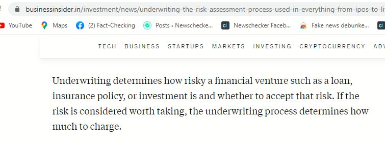 Underwriting എന്താണ് എന്ന് കൃത്യമായി മനസിലാക്കാൻ ഞങ്ങൾ അതിനെ കുറിച്ച് നെറ്റിൽ സേർച്ച് ചെയ്തു. അപ്പോൾ business insider കൊടുത്ത ലേഖനം കിട്ടി.”വായ്പാ പ്രക്രിയയുടെ നിർണായകമായ ഒരു വശമാണ് അണ്ടർ റൈറ്റിംഗ്. അണ്ടർ റൈറ്റിംഗ് സമയത്ത്, കടം കൊടുക്കുന്നയാൾ കടം വാങ്ങുന്നയാളുടെ ക്രെഡിറ്റ് യോഗ്യത അളക്കുകയും അപേക്ഷകൻ ലോൺ യോഗ്യതാ മാനദണ്ഡങ്ങൾ പാലിക്കുന്നുണ്ടോ ഇല്ലയോ എന്ന് വിലയിരുത്തുകയും ചെയ്യുന്നു,” business insider ലേഖനത്തിൽ പറയുന്നു.